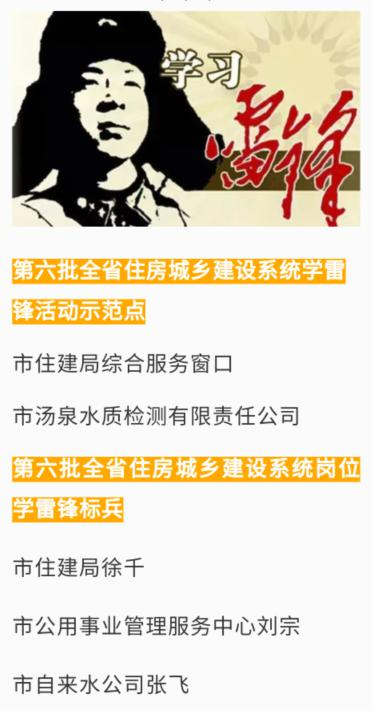 近日,省住建廳下發(fā)《關(guān)于命名第六批全省住房城鄉(xiāng)建設(shè)系統(tǒng)學(xué)雷鋒活動示范點和崗位學(xué)雷鋒標(biāo)兵的通知》,湯泉水質(zhì)檢測有限責(zé)任公司榮獲“全省住房城鄉(xiāng)建設(shè)系統(tǒng)學(xué)雷鋒活動示范點”稱號,公司員工張飛榮獲“學(xué)雷鋒標(biāo)兵”稱號。